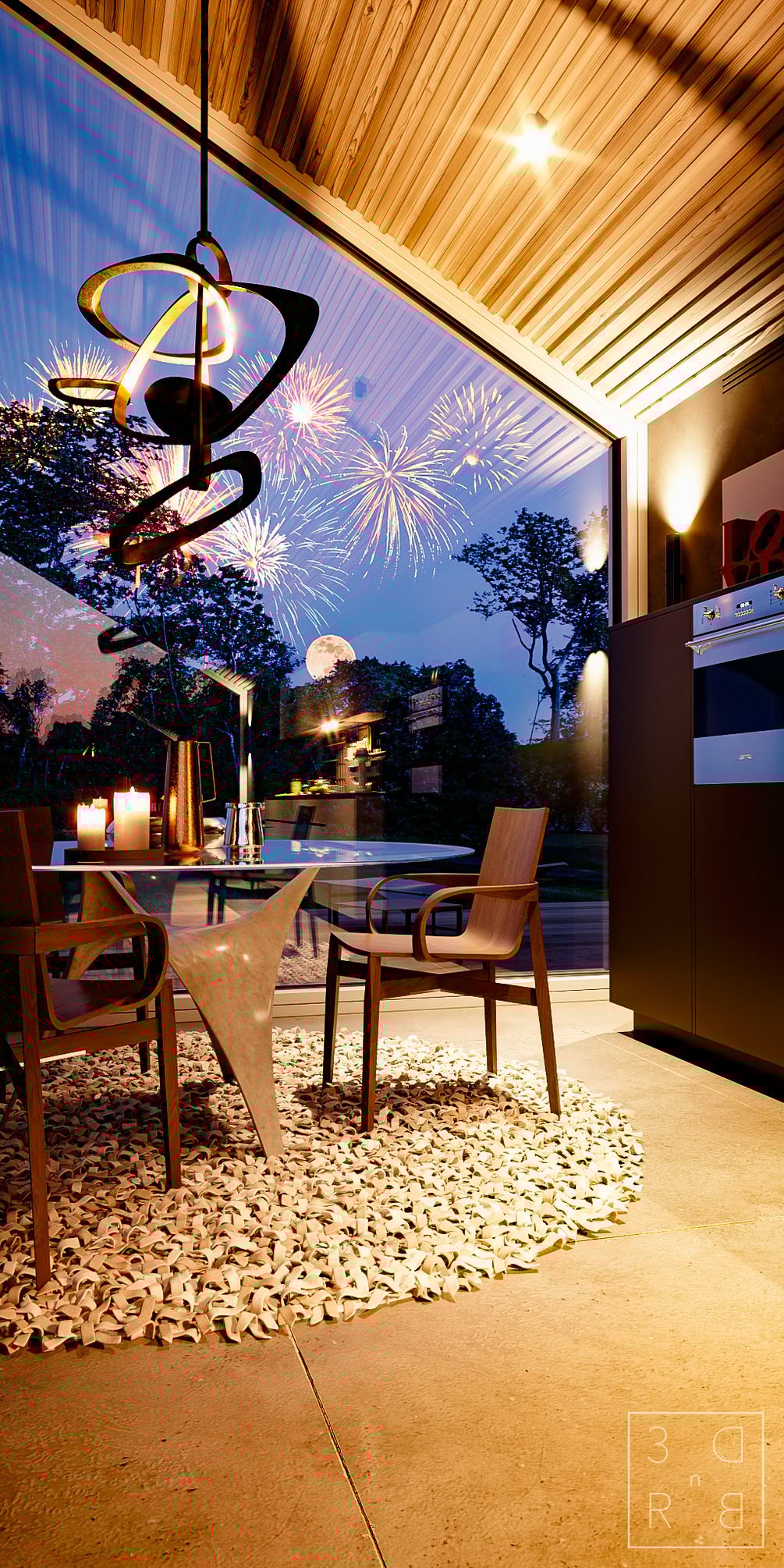 We took advantage of the new Physical Sun/Sky to get a perfect mood for both daylight and night renders, and of course we also added some nice clouds with the dedicated system.